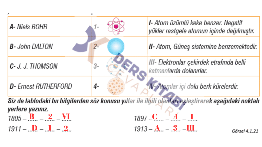 Soru: Aşağıdaki tabloya atom modelleri, bu modellere dair açıklamalar ve modelleri ortaya atan bilim insanları karışık olarak yerleştirilmiş ve aynı zamanda numaralandırılmıştır. Modellerin ortaya atıldığı yıllar ise tablonun altında verilmiştir. Siz de tablodaki bu bilgilerden söz konusu yıllar ile ilgili olanları eşleştirerek aşağıdaki noktalı yerlere yazınız.