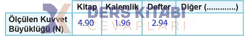Soru: Dinamometrenin ölçüm sınırına dikkat ederek kitap, defter ve kalemlik gibi nesneler ile aynı ölçümleri tekrarlayalım. Sonuçları aşağıdaki tabloya yazalım.